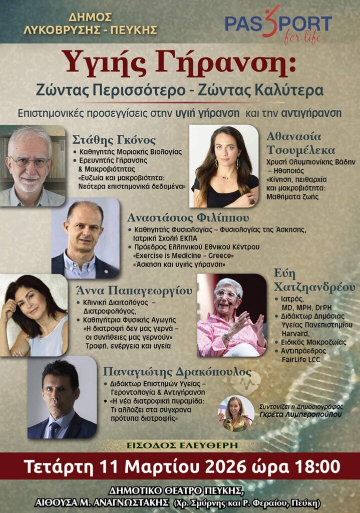 Ο Δήμος Λυκόβρυσης – Πεύκης σε συνεργασία με την ΑΜΚΕ “Passport for Life” διοργανώνει εσπερίδα με θέμα την υγεία, τη μακροζωία και την ποιοτική γήρανση, την Τετάρτη 11 Μαρτίου στις 18:00, στην Αίθουσα «Μ. Αναγνωστάκης» στο Δημοτικό Θέατρο Πεύκης (ισόγειο).